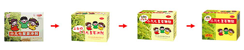三公仔小儿七星茶生产之初是采用塑料瓶包装,为吸引儿童服用,乐于服食,将包装瓶设计成猫型。后考虑到该品种的更大区域的影响力及药效的稳定性,提高疗效,方便服用等原因,引进了日本制的铝塑包装机和印有小儿图案的铝塑包装,正式投产“广州牌”小儿七星茶颗粒。
